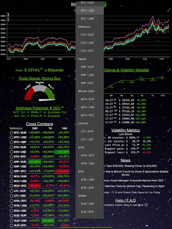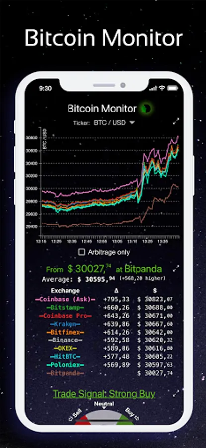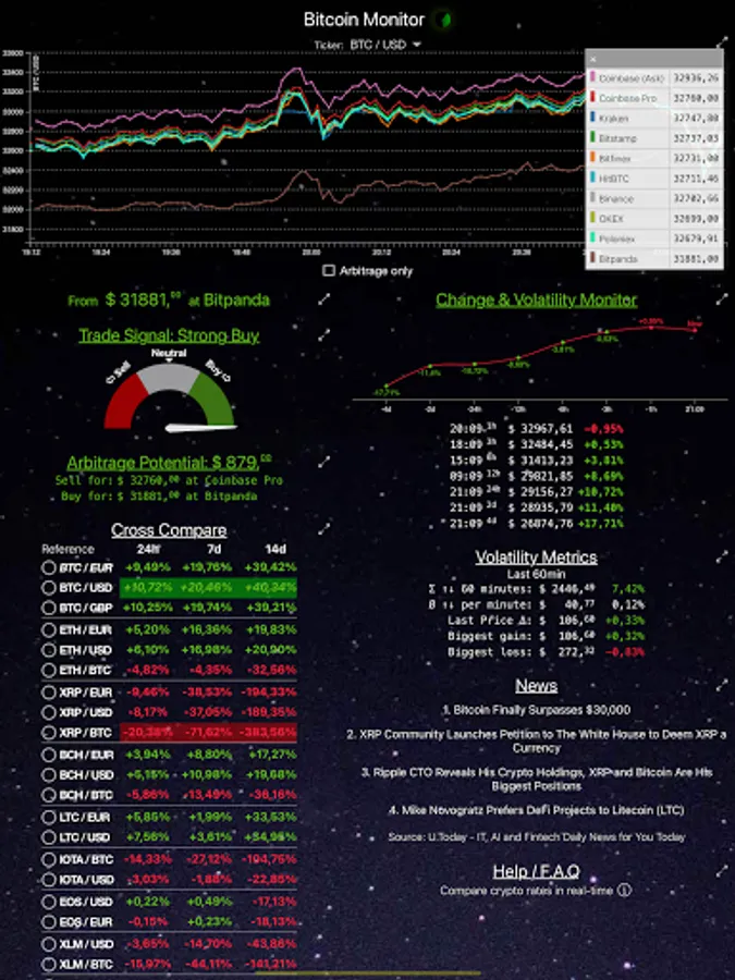 ☆ Simultaneous price comparison of multiple exchanges like Kraken, Binance, Coinbase, Coinbase Pro, Poloniex, OKEX, HitBTC, Bitpanda, Bitfinex, Bitstamp & Coinfinity