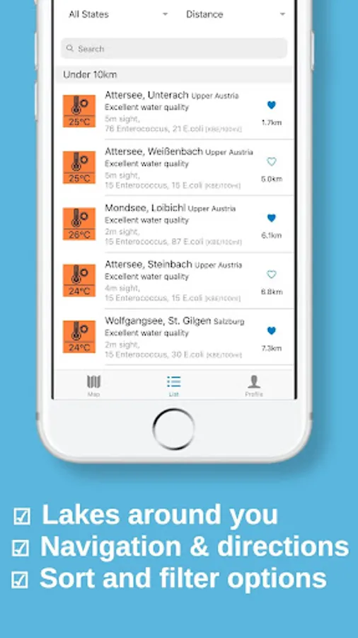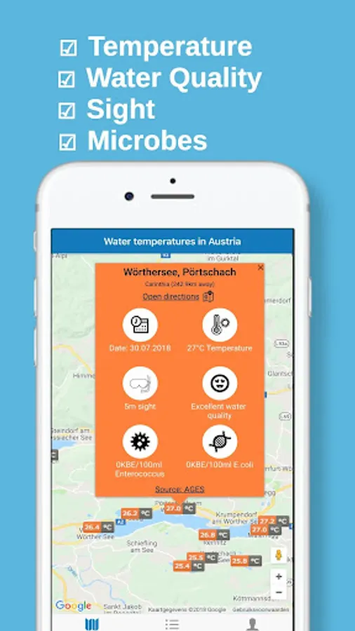 You can switch between a map visualization that displays all the measuring points with their temperature (in degrees Celsius), or an extensive list with filtering and sorting options, e.g. distance from your location, the state the lake is located in, water temperature, water quality, etc. The map also gives you directions to a point of interest and displays the lake's data in a simple infographic.