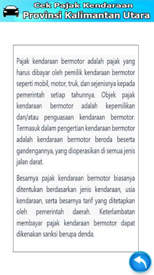 The North Kalimantan North Kalimantan Vehicle Tax Check Application is an application aimed at residents and vehicle owners in the North Kalimantan province of North Kalimantan. This application aims to make it easy for users to check information related to their motor vehicle tax quickly and practically. Following is a brief description of this application.