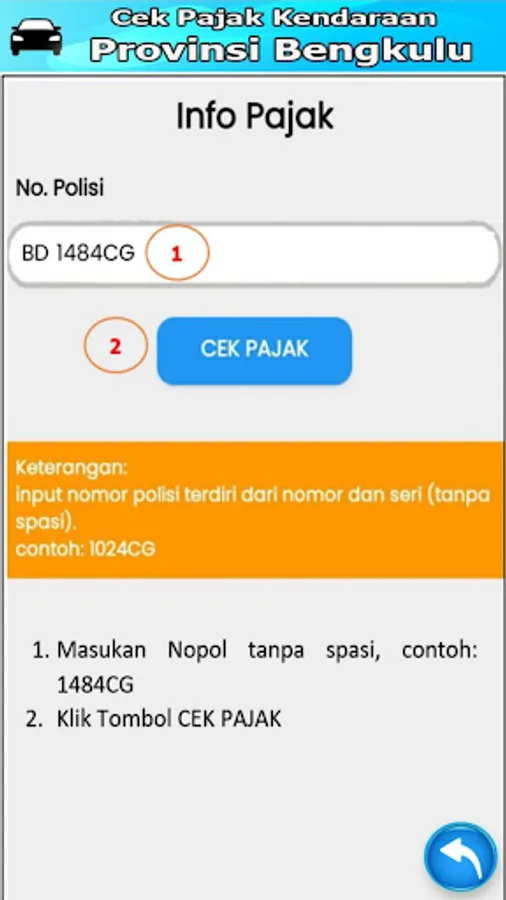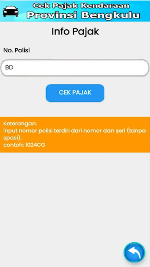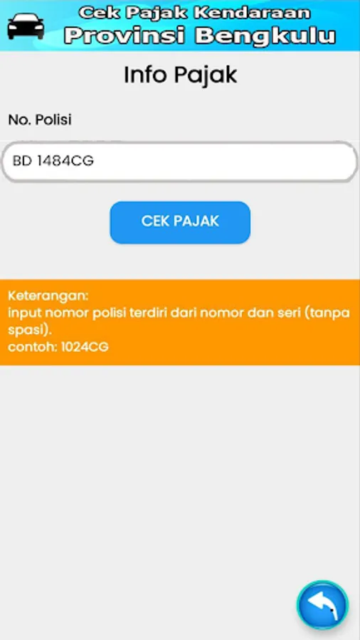 The Bengkulu Vehicle Tax Check Application is an application aimed at residents and vehicle owners in Bengkulu province. This application aims to make it easy for users to check information related to their motor vehicle tax quickly and practically. Following is a brief description of this application.