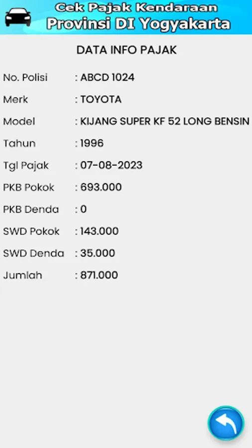 Jogja DIY Yogyakarta Vehicle Tax Check is a tool that makes it easy for you to find out the status of your motor vehicle tax info in the province of Jogja DIY Yogyakarta. With a simple and user-friendly interface, you can quickly check whether your vehicle is registered and pay taxes correctly. This application provides accurate and up-to-date information regarding the amount of tax that must be paid, the due date, and the history of previous tax payments. You can find out the tax payment due date, so you can avoid unnecessary fines. This application makes the vehicle tax inspection process more efficient and transparent, helping you stay compliant with traffic regulations and tax obligations.