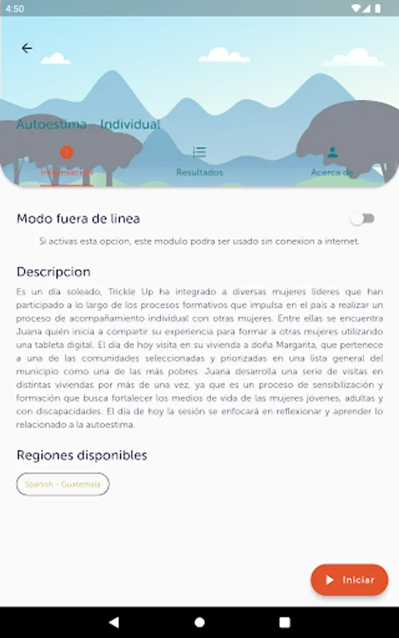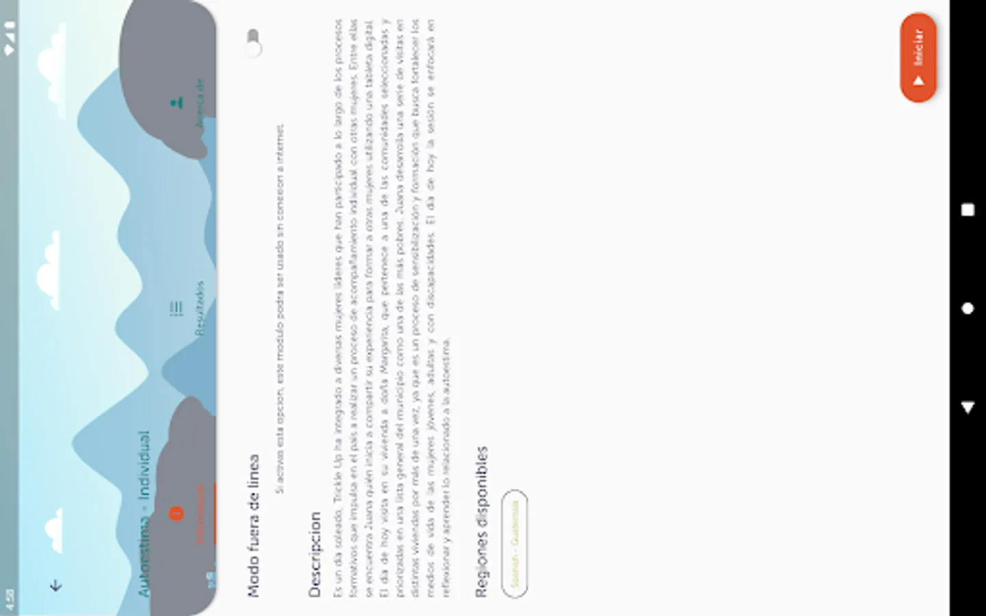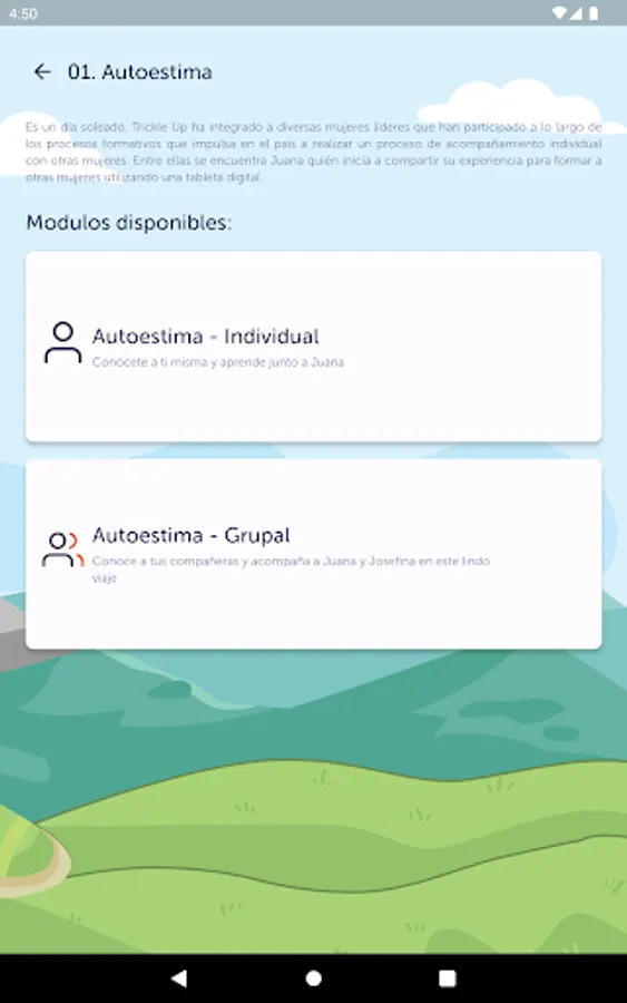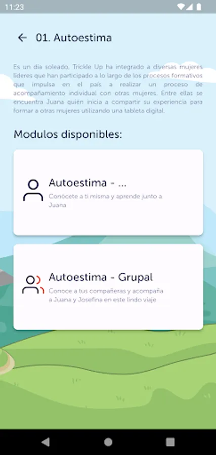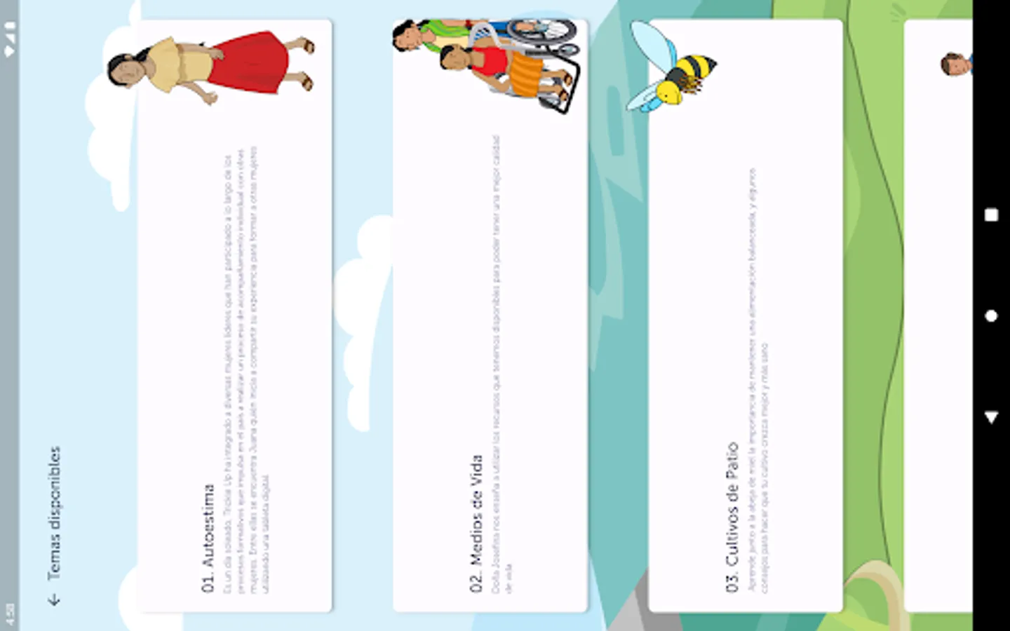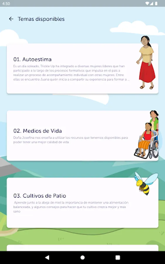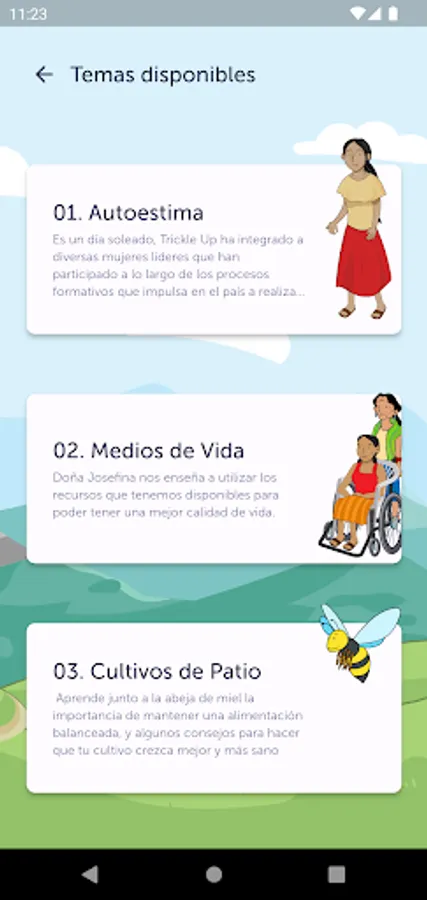 Juana, Margarita, Manuel, Doña Josefina, and the entire community of characters will accompany people in their process of personal growth. With 12 topics and more than 36 different activities, this interactive experience is the perfect companion for Trickle Up technicians in their facilitation process.