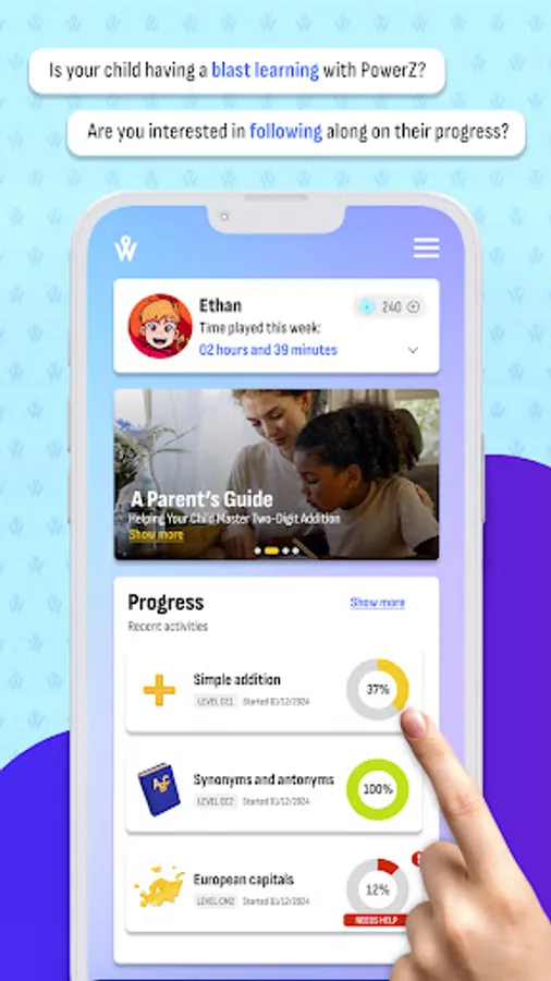 Thanks to PowerZ Family, you can now receive detailed notifications of your kids’ progress. These notifications are designed to inform you of significant progress in different skills, allowing you to celebrate each stage of their learning. Whether it's individual improvement or multiple advances, you'll always be in the know about their prowess.
