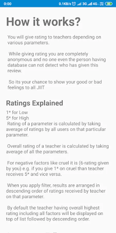 Through this app jiit student can review their teacher on various parameters and they will remain anonymous. App contains anonymous talk messaging feature and no one will know what you has written, you can also use this feature to report problem or request to add new teacher.