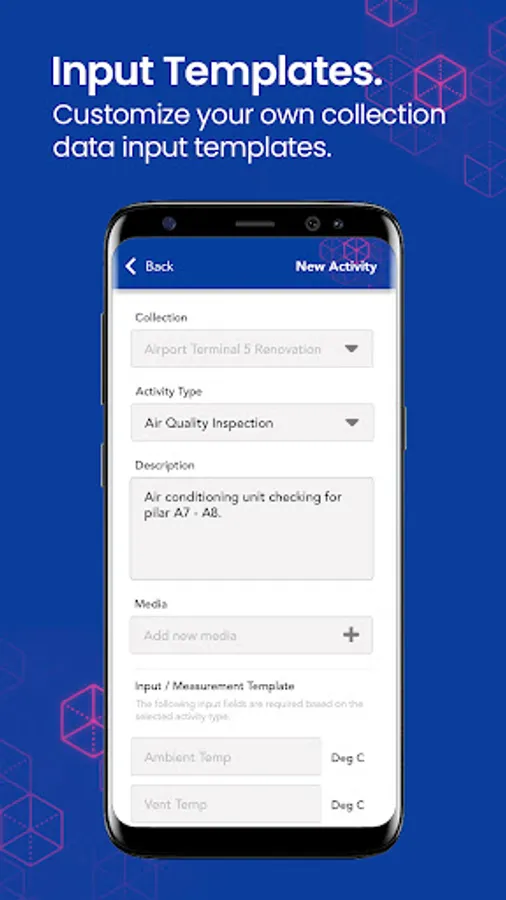 Survee provides the ability for user to define input template according to the selected activity type, allowing them to enter routine data acquisition procedure with predefined unit of measurements.