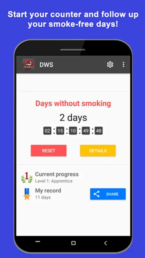 🚠Quitting smoking is always worth it at any time of life, even if the person already has a disease caused by smoking, such as cancer or emphysema. With this app you can follow your evolution day by day counting your smoke-free days.