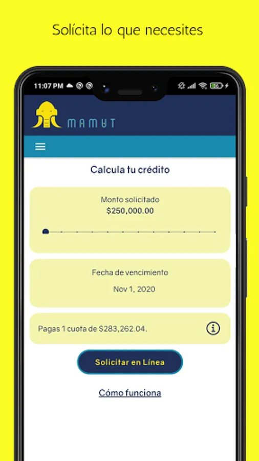 With the Mamut Soluciones Colombia app, you can easily, quickly and safely make your credit requests for whatever you want, in addition to requesting your credits, you can perform tasks such as payments and editing of your data. You will have a brief description of what you need and steps to follow so that you have a great experience when applying for your credit.