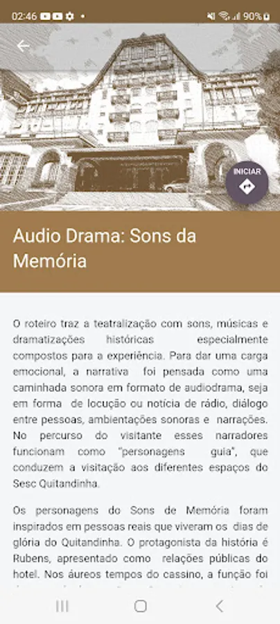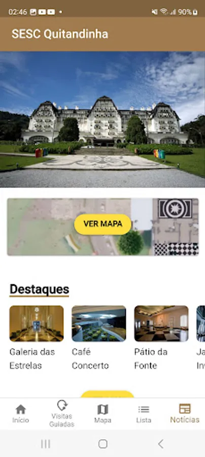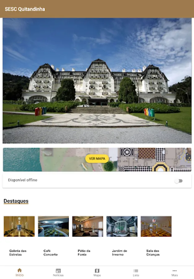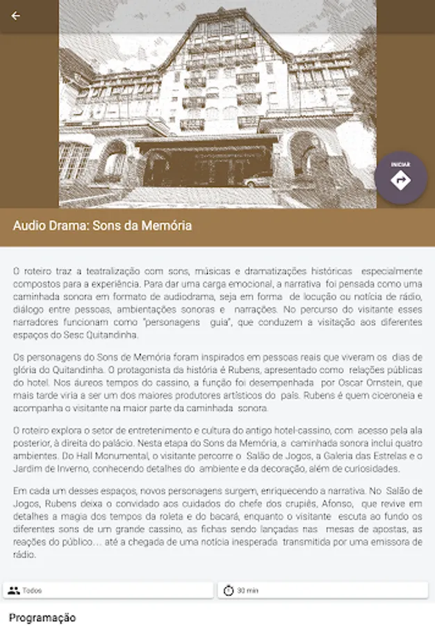 The App Centro Cultural Sesc Quitandinha (CCSQ) is your face-to-face guide to the CCSQ. Using location identification technologies, the App understands the space where you are and brings information by proximity, guiding you through the CCSQ.
