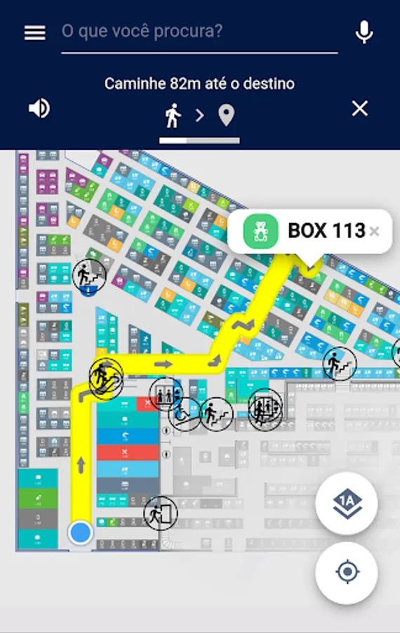 To guide the customer to the desired destination, the new Oi application uses digital flags distributed throughout the complex, which work as an Indoor GPS. They allow the app to accurately identify the customer's position and provide "3D paths," meaning that they can span multiple multi-story maps, starting on one floor and proceeding along transitions such as stairs, escalators, and elevators to the floor of destination.