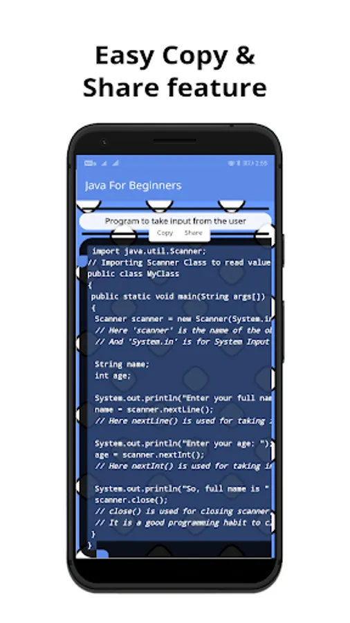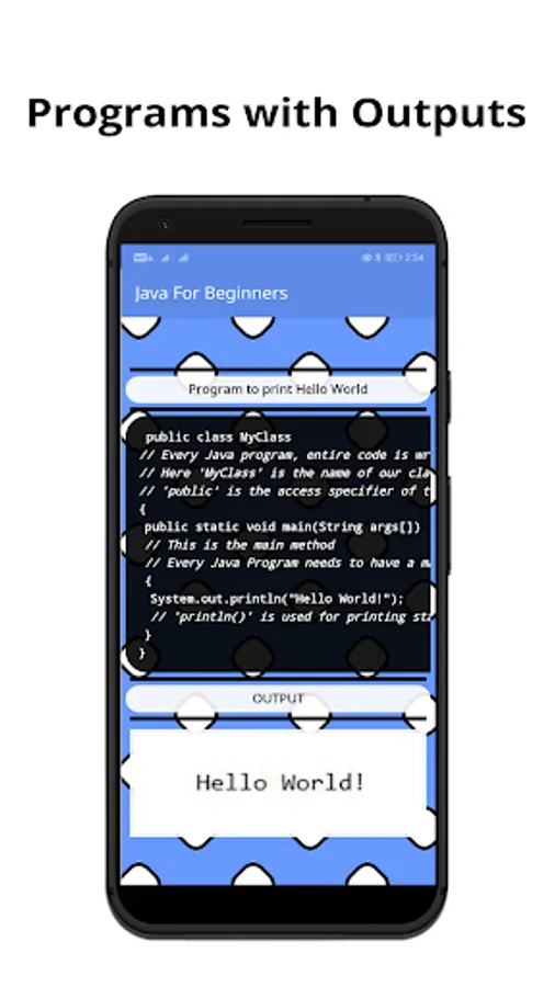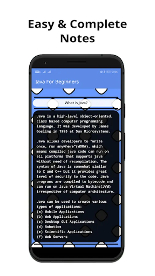 Java For Beginners is directed towards the users who are absolute beginners in programming. The main purpose of this app is to provide notes and programs of core basic concepts of Java Programming Language. Every topic is explained in detail, so you can understand programming concepts thoroughly. Every program is explained with proper comments, so you won't face any difficulty in understanding the structure of any program. The programs also comes with pre-compiled outputs, so you don't have to recompile them which helps in saving your time and also provides you the result on the spot.