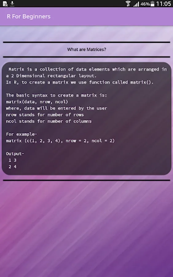 R For Beginners focuses on providing the basic knowledge about programming in R to you all at one place. Our tutorials with comments will guide you to understand R from beginning.