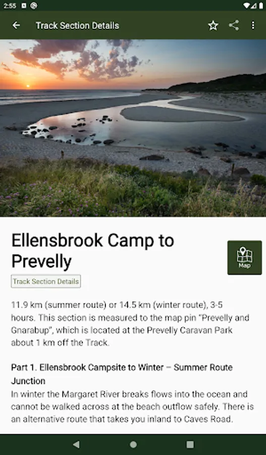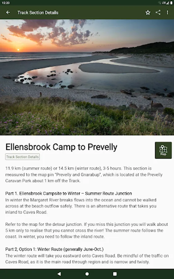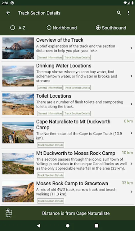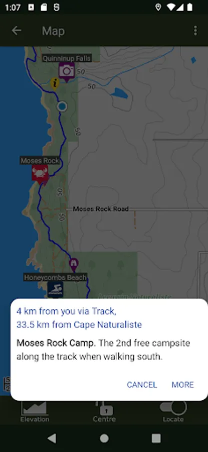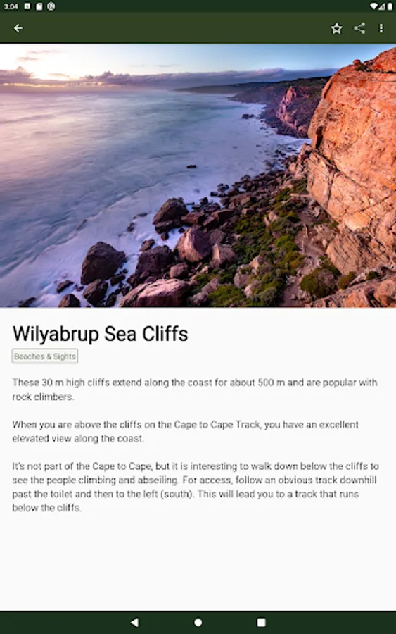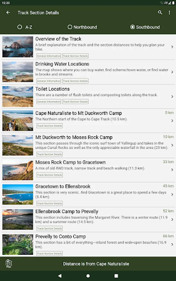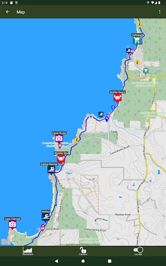 The guide works 100% without needing mobile phone reception or Internet access. The offline maps are very detailed, show the Cape to Cape Track, show where you are via GPS, and are marked up with camping areas, sightseeing, water sources, places to swim, some accommodation, restaurants and food shops, the best beachs, sights and many other points of interest. The App shows you how many kilometres you are from places like camping area and towns, and has an interactive elevation graph so you can see what hills are between you and places.