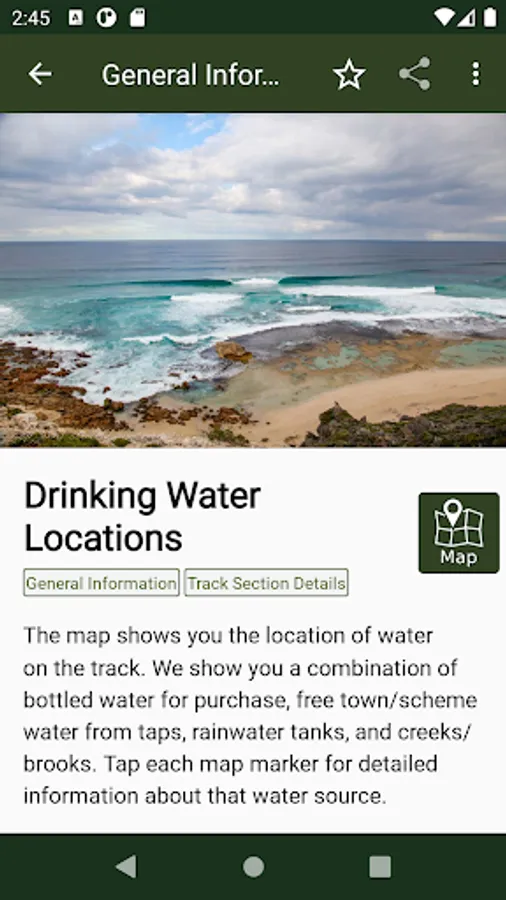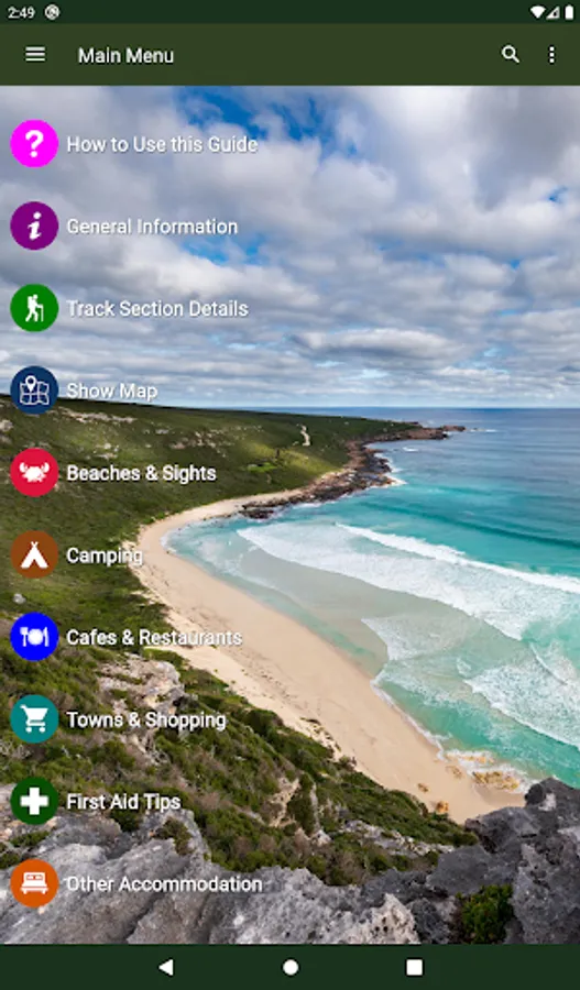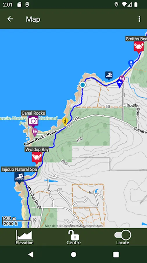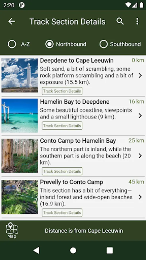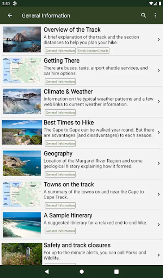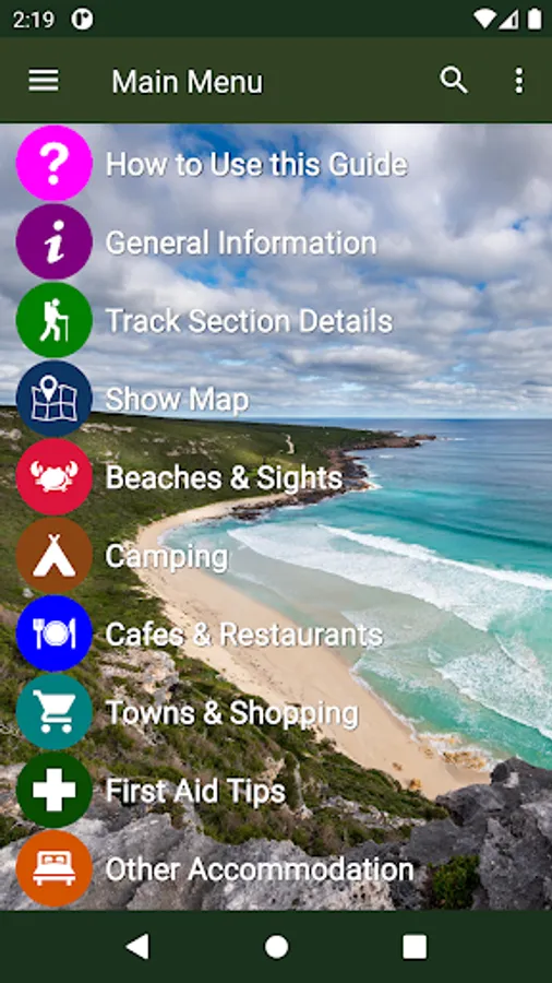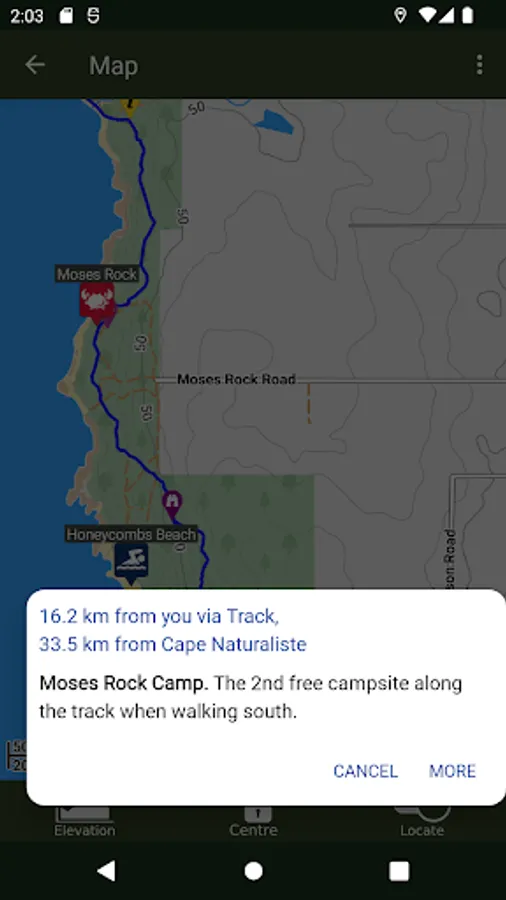 The guide works 100% without needing mobile phone reception or Internet access. The offline maps are very detailed, show the Cape to Cape Track, show where you are via GPS, and are marked up with camping areas, sightseeing, water sources, places to swim, some accommodation, restaurants and food shops, the best beachs, sights and many other points of interest. The App shows you how many kilometres you are from places like camping area and towns, and has an interactive elevation graph so you can see what hills are between you and places.
