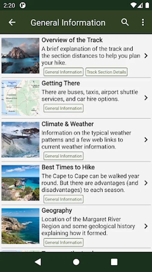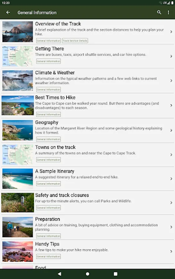 The App has advice on how to prepare for your trip, what gear to bring, when to walk, possible itineraries and suitable food. It has many other features, photos and information, as described below.