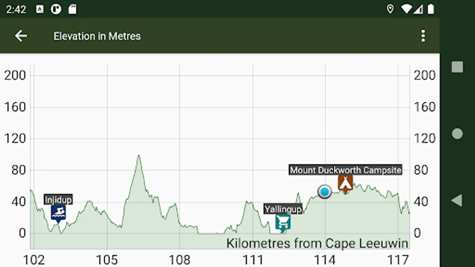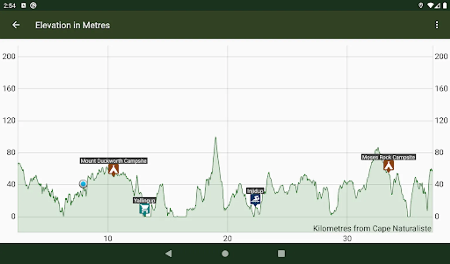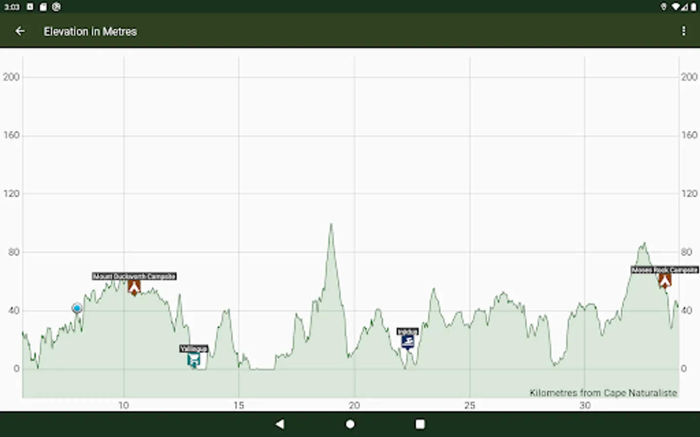 - The elevation graph shows your location and has markers for towns, camping and other places. Use it to see if you have to walk up any big hills to get to that next camping area?