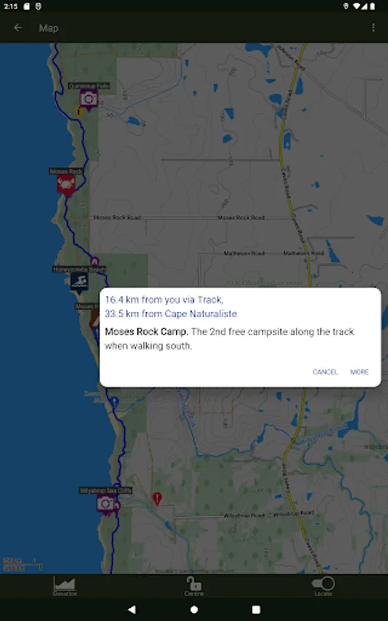 - Tap place markers on the map and be shown your distance from them along the track. See how far away that camping area is!