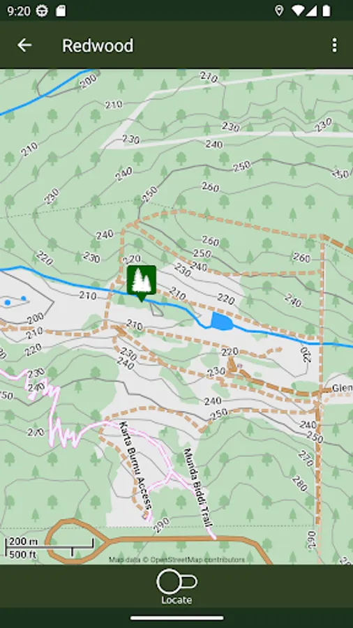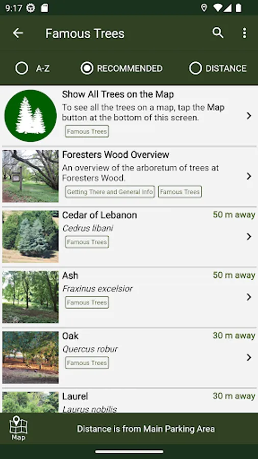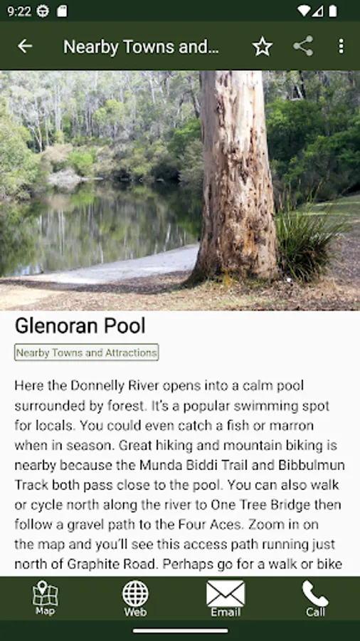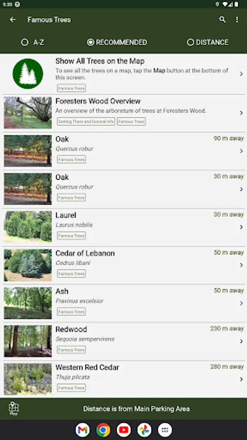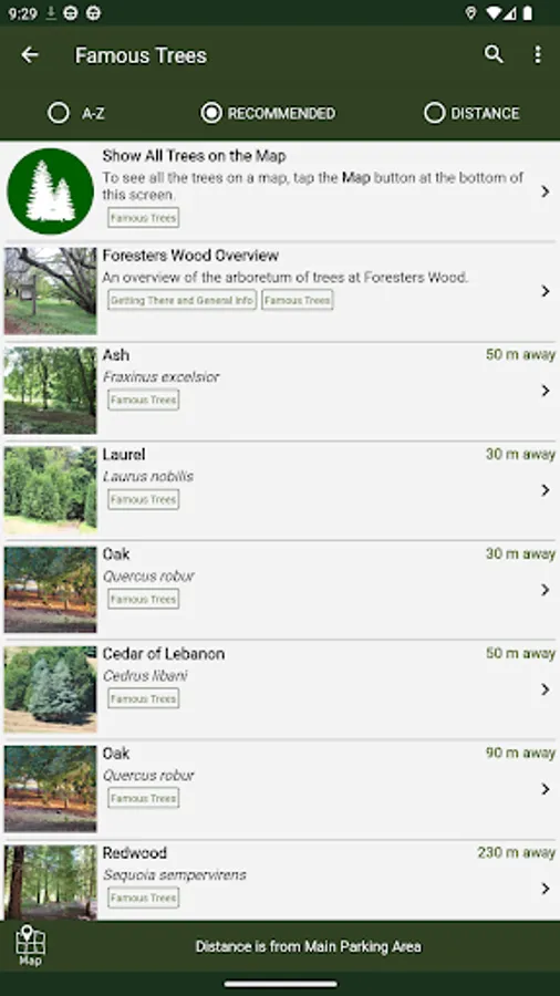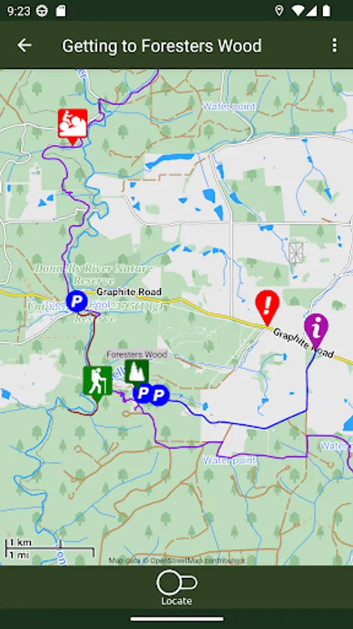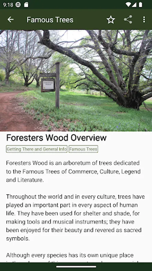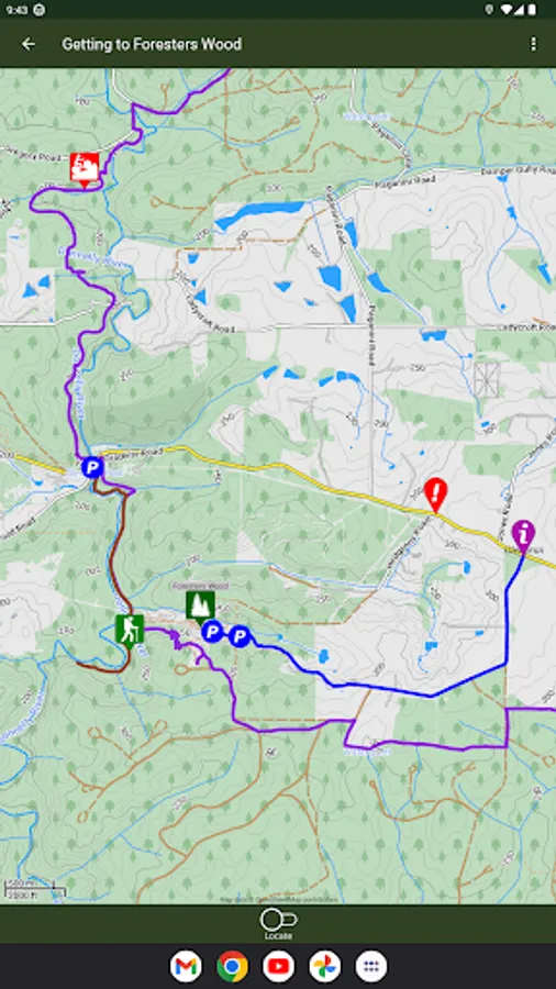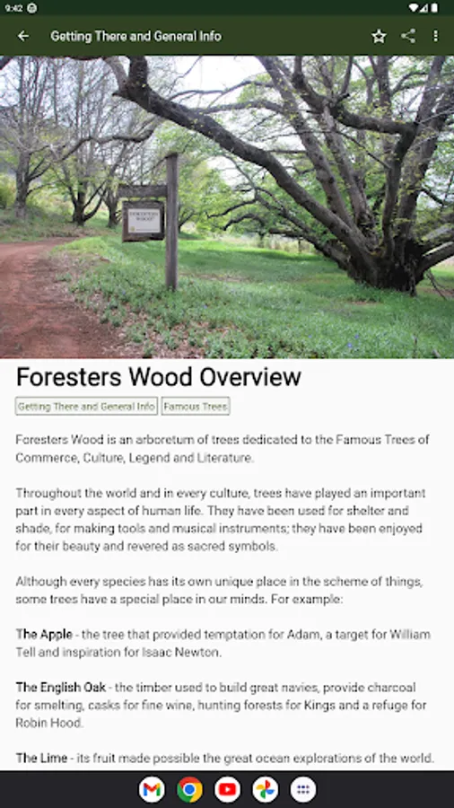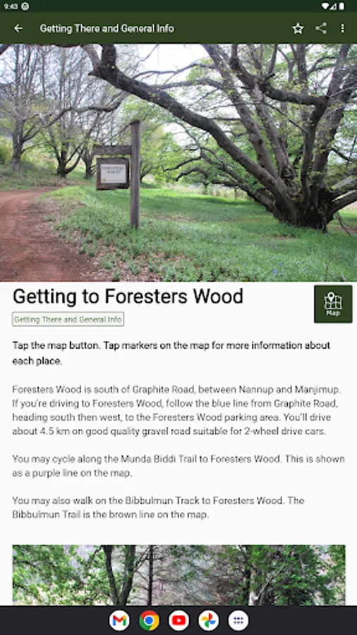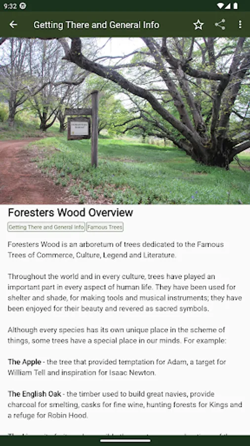 This App also shows the location and details of nearby places of interest and tells you how to get to Foresters Wood.