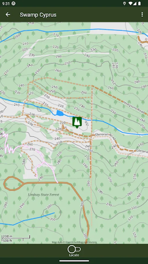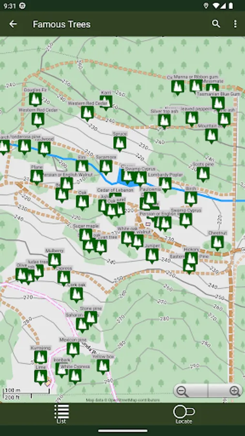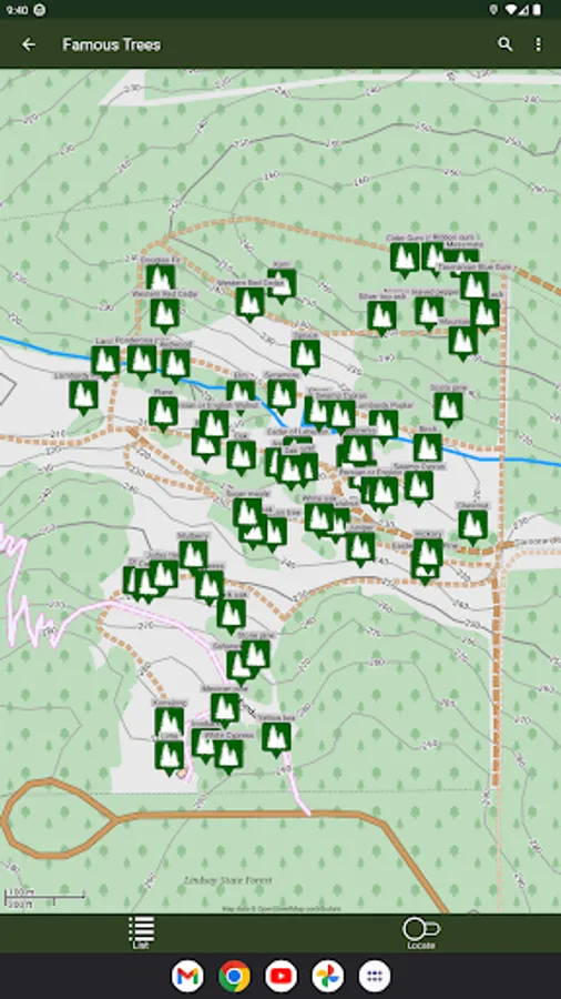 The detailed map shows where all of the different species are located in the Wood. The App, by using GPS, shows where you are in relation to each of them.