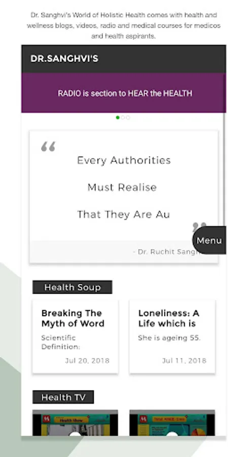 This App is intending to provide free holistic health education to the lives by the means of free video tutorials, guided meditation, health article, health tips and academic activities of Dr. Ruchit Sanghvi.