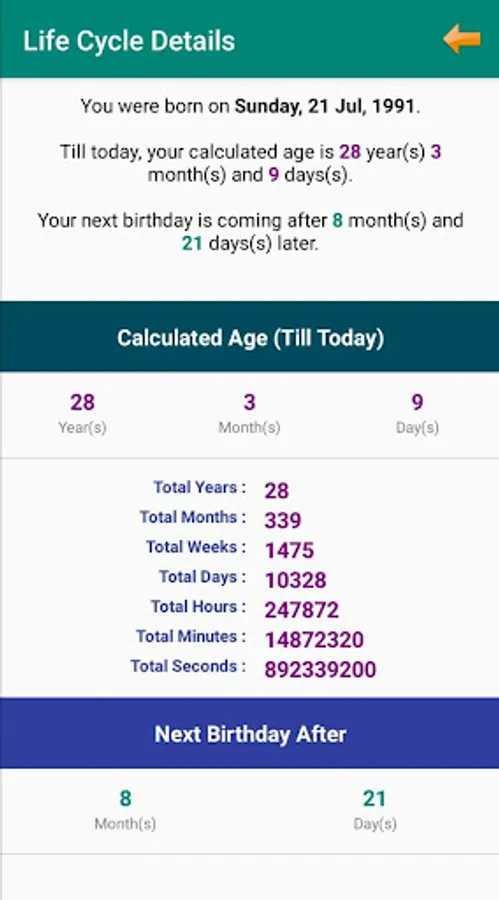 ► Find out your total life cycle in year, month, day, hour, min and in sec.