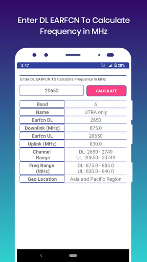 This app also provides information about the frequency bands details approved by 3GPP with frequency range, duplex Mode, and allowed bandwidth.