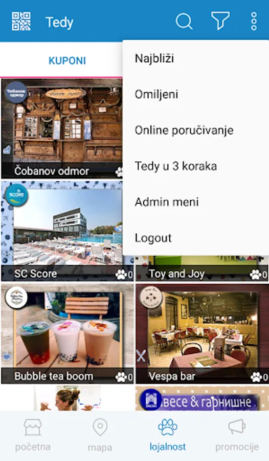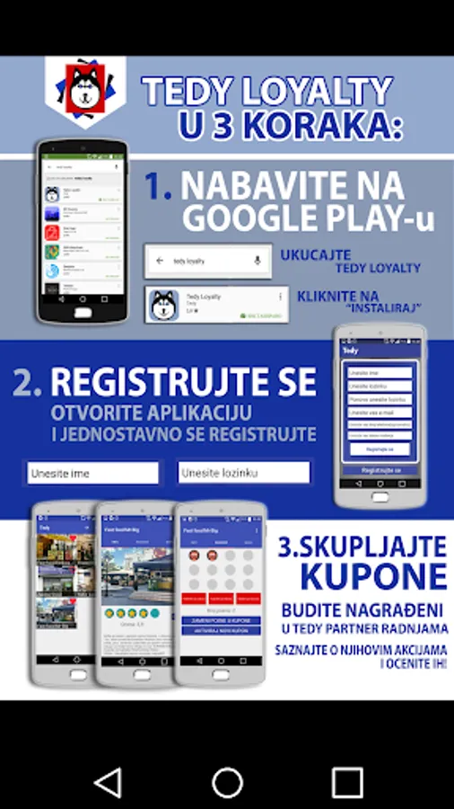 Tedy aplikacija je i prvi digitalni lojalti program preko koje možete biti nagrađeni u vašim omiljenim lokalima. Svaki lokal sa Tedy stikerom je naš PARTNER a kod svakog našeg partnera kupovinom njihovih proizvoda ili usluga ostvarujete kupone ili poene. Nakon određenog broja sakupljenih poena ili kupona bićete nagrađeni. Najbolje od svega je što sve kupone i poene čuvate u svom mobilnom telefonu i nikad ih ne možete izgubiti što je čest slučaj sa raznim karticama lojalnosti.