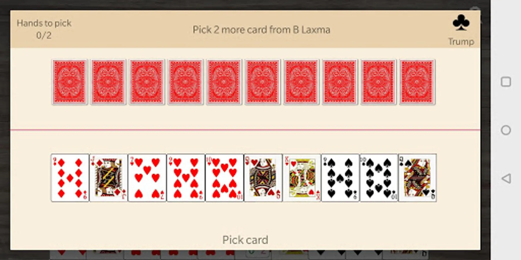 From eight to king all four suits heart, diamond, spade and club are present. Each player have to make some amount of hand wins to keep winning. Player who have to make five hands will choose trump from one of suits from diamond, club, heart and spade. Once he choses the trump game will start. Trump is the suit which will have highest power if cards of suit of running hand is not present apart from color card number also matter. Higher the number more powerful is cards.