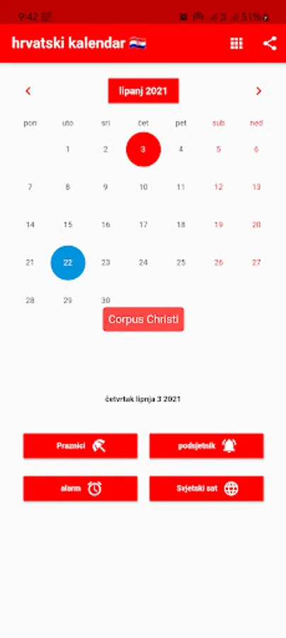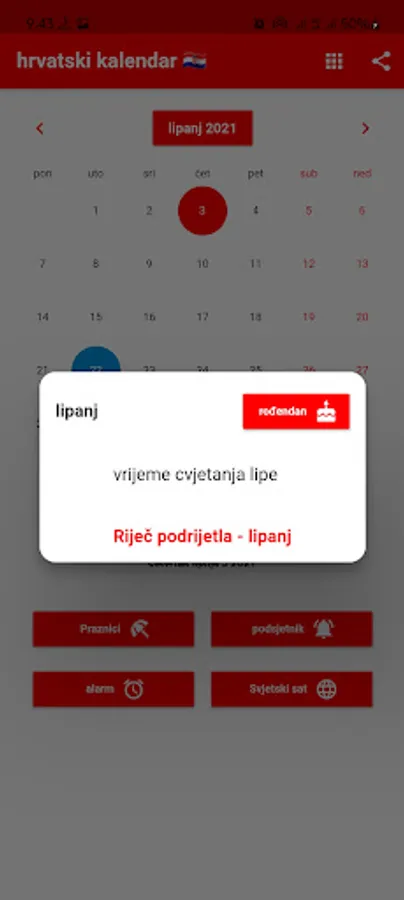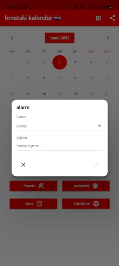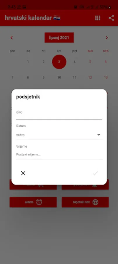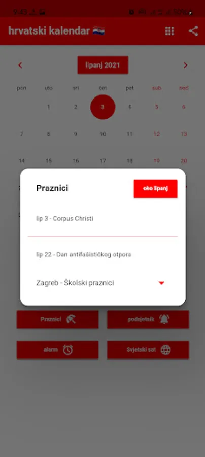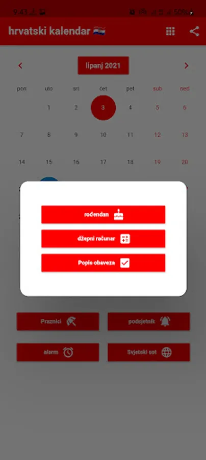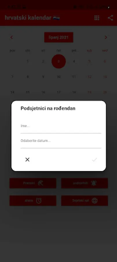 Možete postaviti podsjetnike i primati obavijesti u pravo vrijeme. Podsjećamo vas na Hrvatske blagdane. Možete registrirati rođendane svojih prijatelja i obitelji kako biste bili unaprijed obaviješteni. Uključeni su praktični alati poput kalkulatora, svjetskog sata i alarma. Svjetski sat prikazuje vrijeme u različitim gradovima svijeta. Naš kalendar sadrži popis obaveza s poviješću podrijetla svakog mjeseca. Hrvatska po lokalnom vremenu. Prevoditelj.
