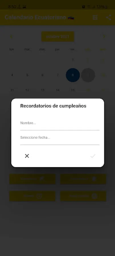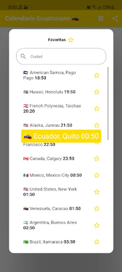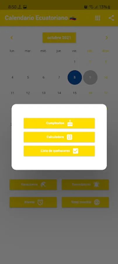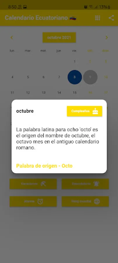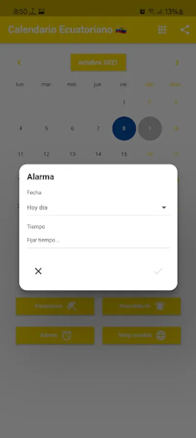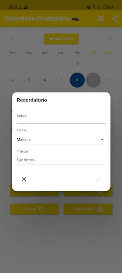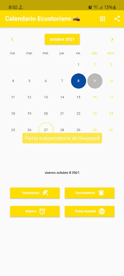 You can set reminders and receive notifications at the right time. We make sure to remind you at Ecuadorian Vacations. You can register the birthdays of your friends and family to receive notifications in advance. Useful utilities such as Calculator, World Clock and Alarm are included. World Clock shows the time in different cities of the world. Our calendar includes a to-do list with history of origins for each month. Ecuador Local time. Translate.