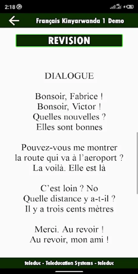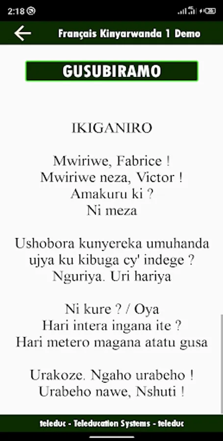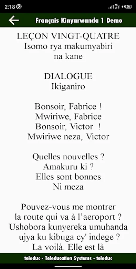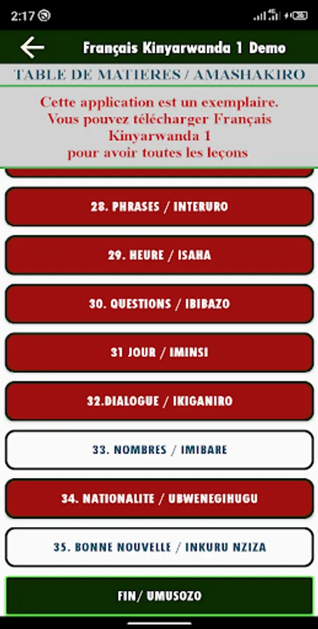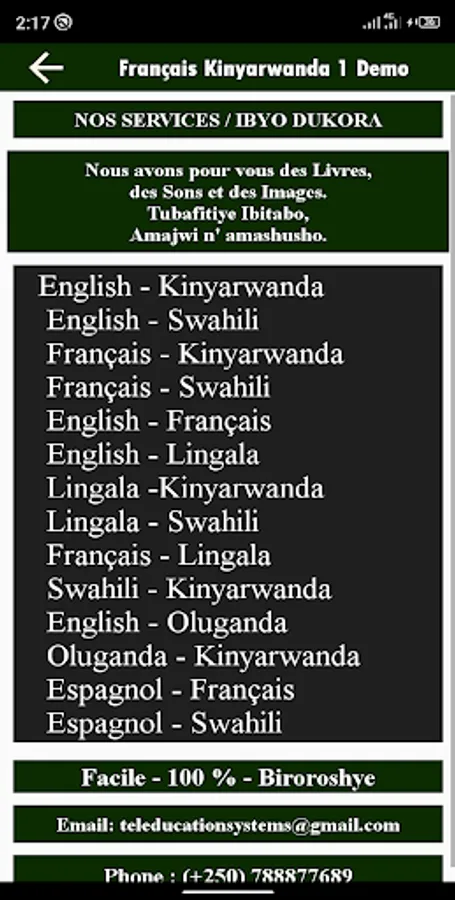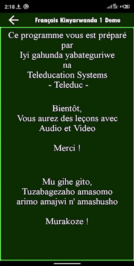 Cette Application permet d’apprendre le Français ou le Kinyarwanda avec facilité. Elle possède trente-quatre leçons contenant chacune des sujets variés qui aident les utilisateurs à développer la communication très rapidement.