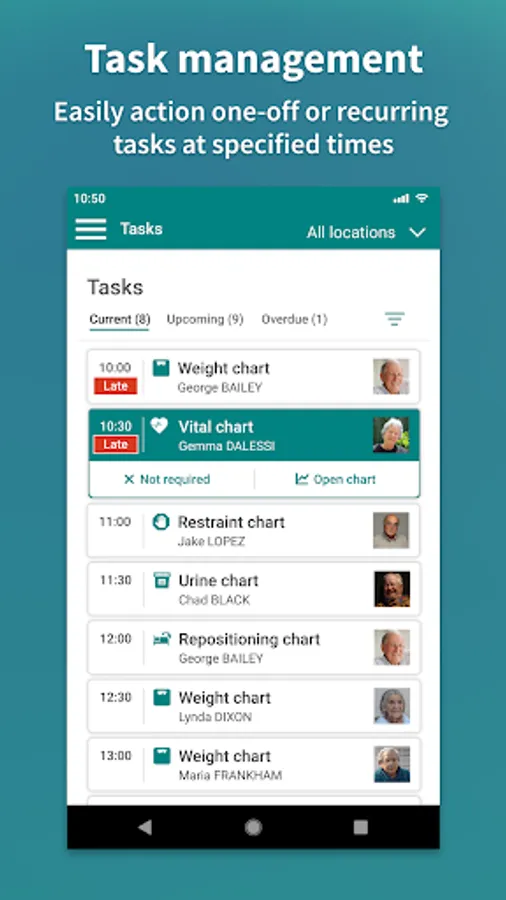 The app creates a workflow of care activities that need to be completed throughout the day, providing care staff with an easy-to-follow list to work though and helping prevent missed tasks. A user-friendly interface for a large array of charts makes documentation fast and paperless, while access to the resident record ensures important data is within easy reach at all times.