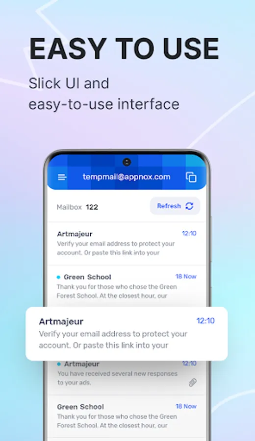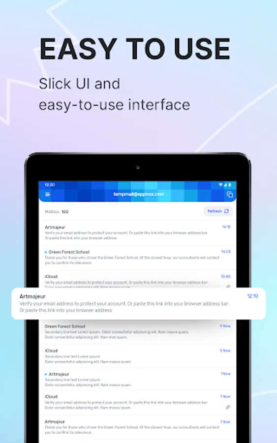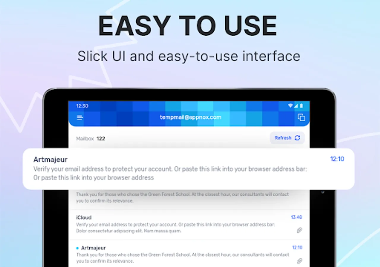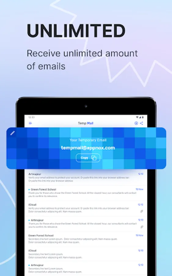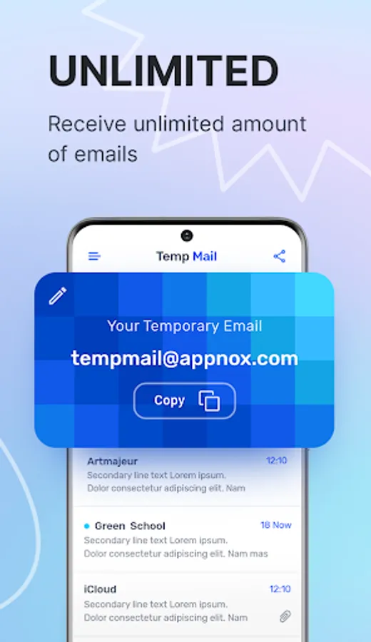 Temp Mail is a real life-saver in the era of information overload. The best way to stop that email littering and get rid of junk emails coming to your mailbox is to use a temporary mail generator. Our Temp Mail app is the best fake email generator that lets you forget about annoying ads, spam, and phishing attempts coming to your real inbox by providing you with a unique temporary email address.