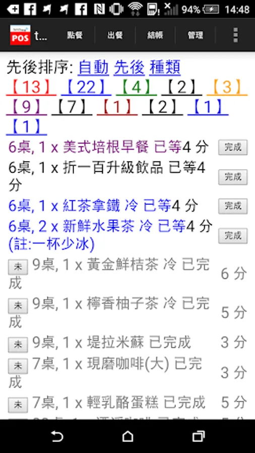 點餐完成同時,吧台廚房已看到該做的餐飲了,點選完成後,可統計點餐至出餐的時間