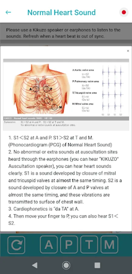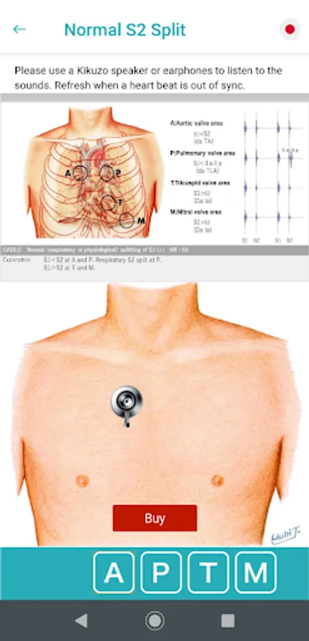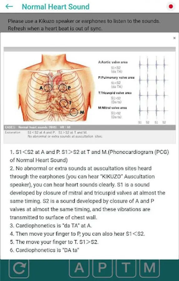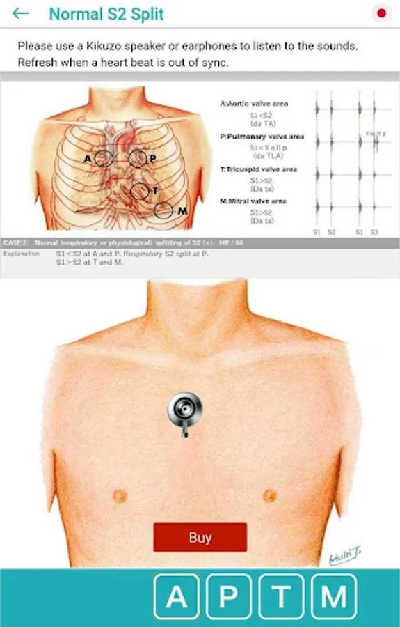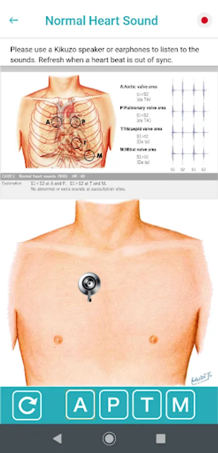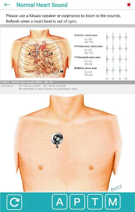 When you press the A, P, T, M buttons on the auscultation site, the icon moves to each site and you can “learn the site and sound at the same time”."