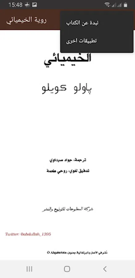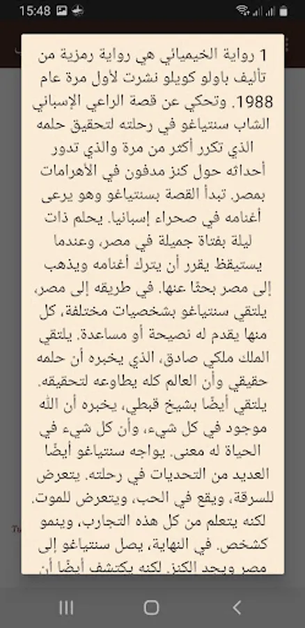 وتحكي عن قصة الراعي الإسباني الشاب سنتياغو في رحلته لتحقيق حلمه الذي تكرر أكثر من مرة والذي تدور أحداثه حول كنز مدفون في الأهرامات بمصر