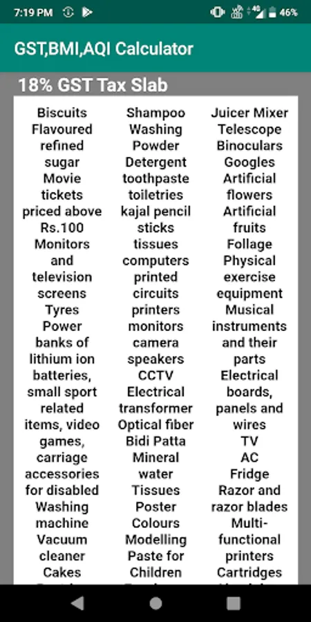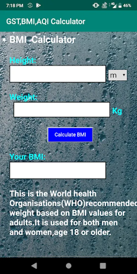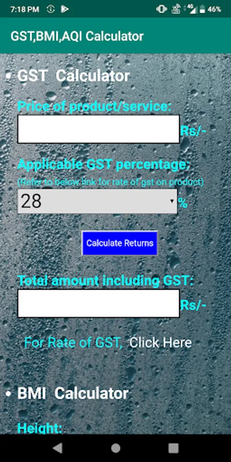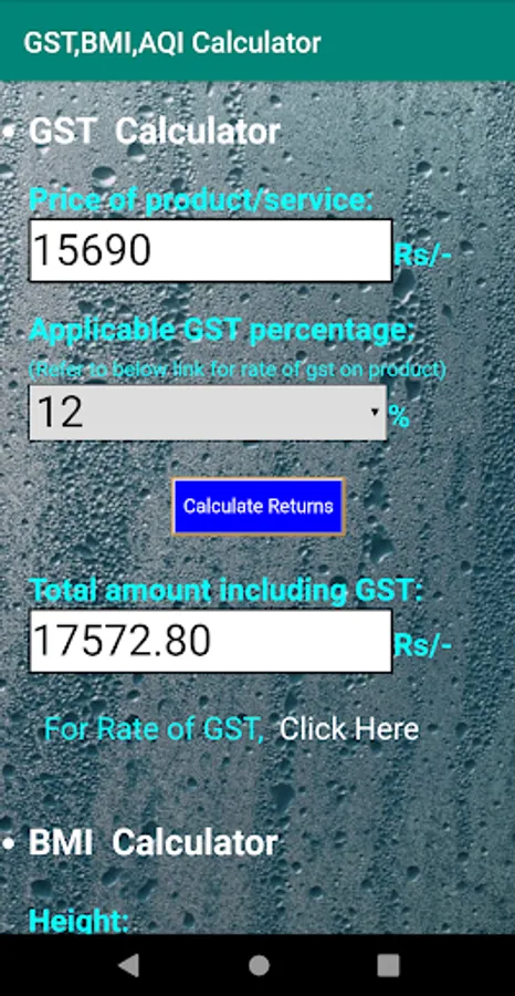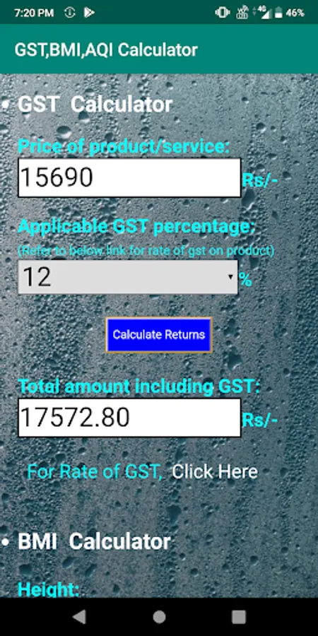 Total amount including goods and service tax is calculated based on 4 different tax slabs for various goods and services in India,body mass index is calculated by the height in m/cm and weight in kg.