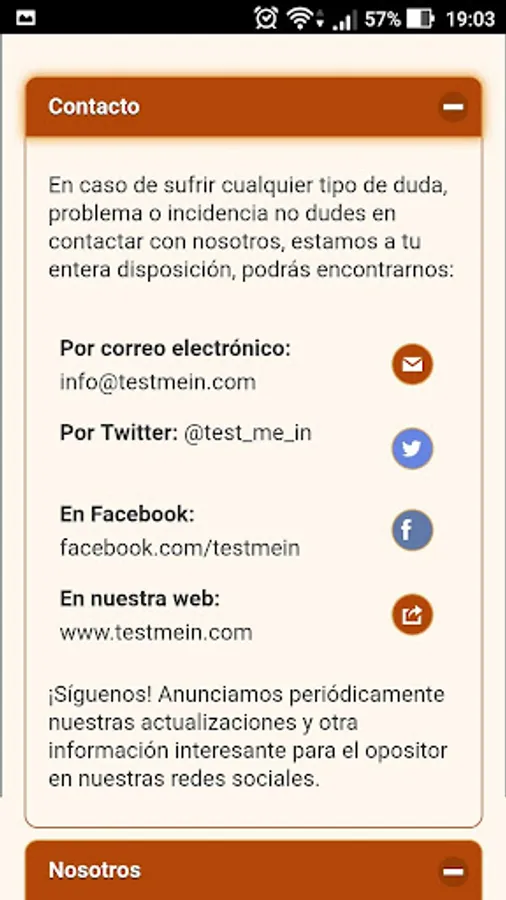 We have assistance via e-mail (info@testmein.com) through the app to resolve questions, questions and questions about the content or operation of the application.