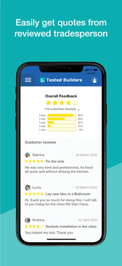 The qualifications of each tradesman on Tested Builder go through several checking and testing processes. To ensure future quality maintenance our builders receive customer feedback as a reward for good work and held accountable for any problems. Once the job completed, homeowners can write reviews for the tradespeople they have experienced.