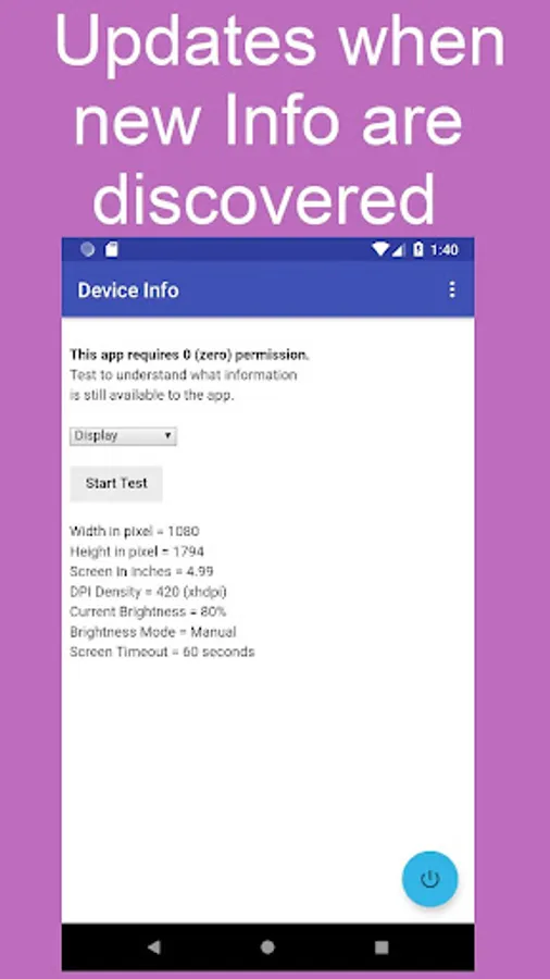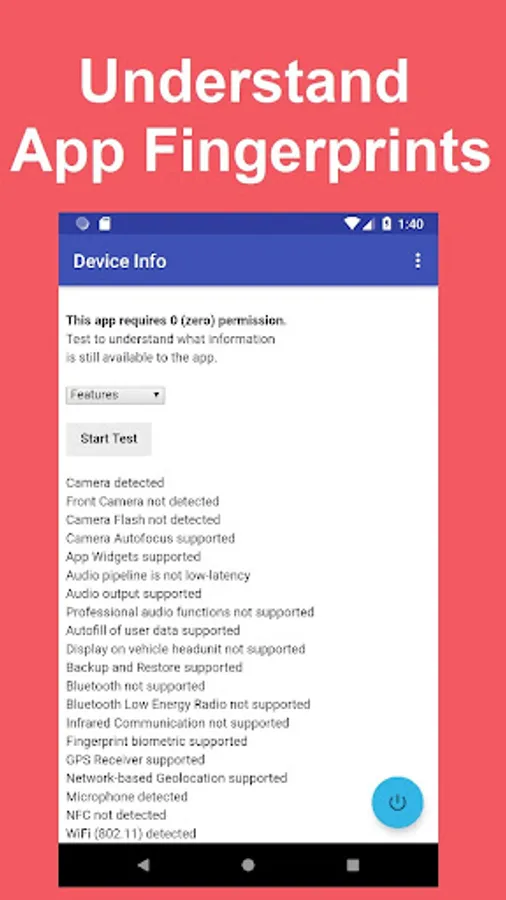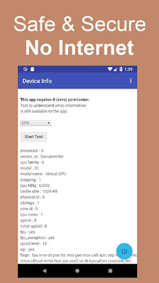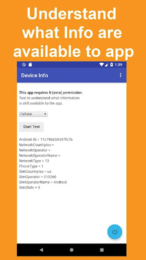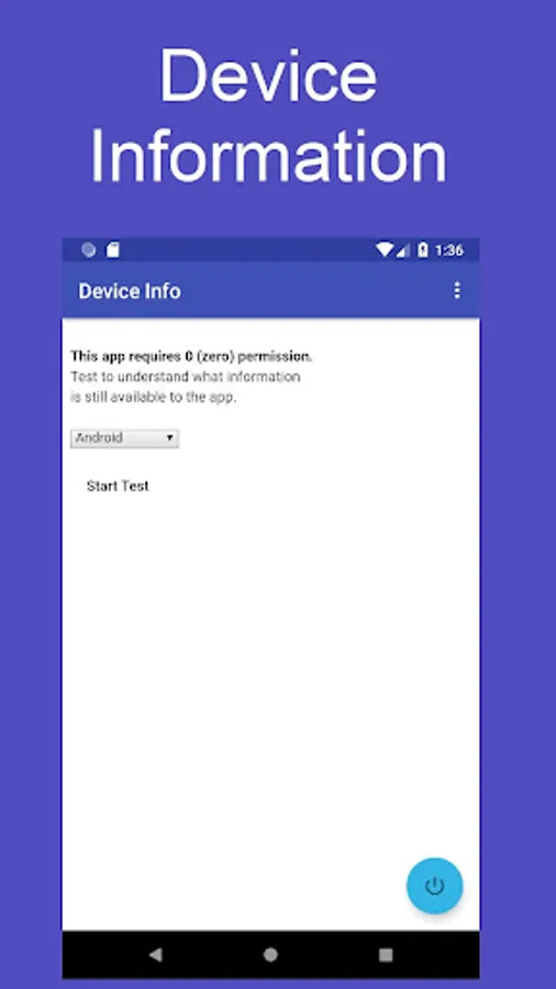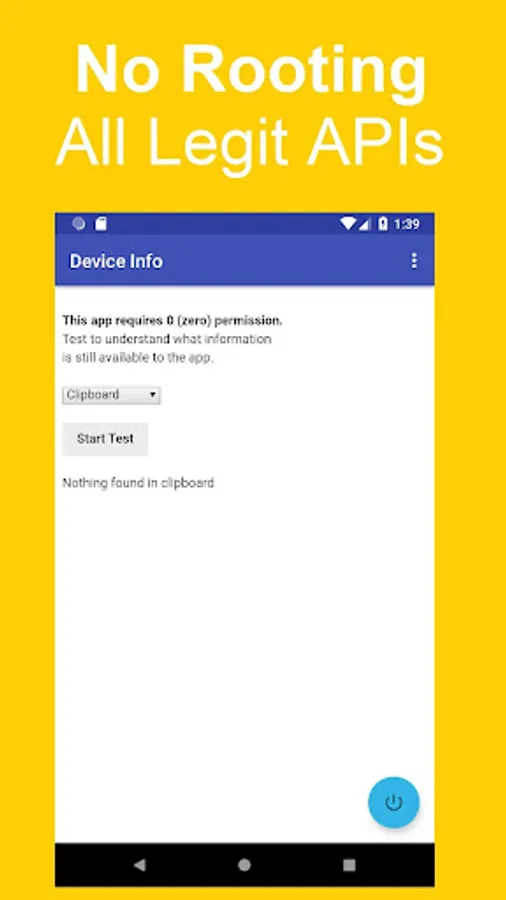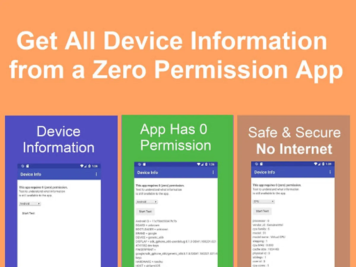 This app will provide information about your Android™ device using all available APIs, shortcuts, and workaround methods, but without using any Android™ permission. This is a tool to allow users or developers to understand the risks of information theft and information privacy that exists even in an app without any permission.