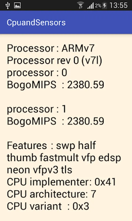 Display all the most important CPU factor like processor name, rev, model name, BogoMIPS, features, fastmult, cpu implementer, cpu architecture, cpu variant, cpu part etc.