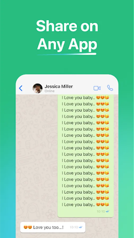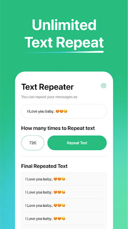 Text Repeater is a simple and easy-to-use app that allows you to send multiple messages or repeat words over and over again. Just enter the text you want to repeat, set the number of times you want it to be repeated, and hit send. Text Repeater will take care of the rest.