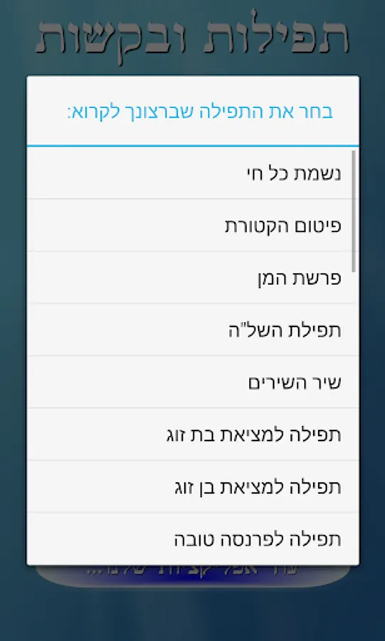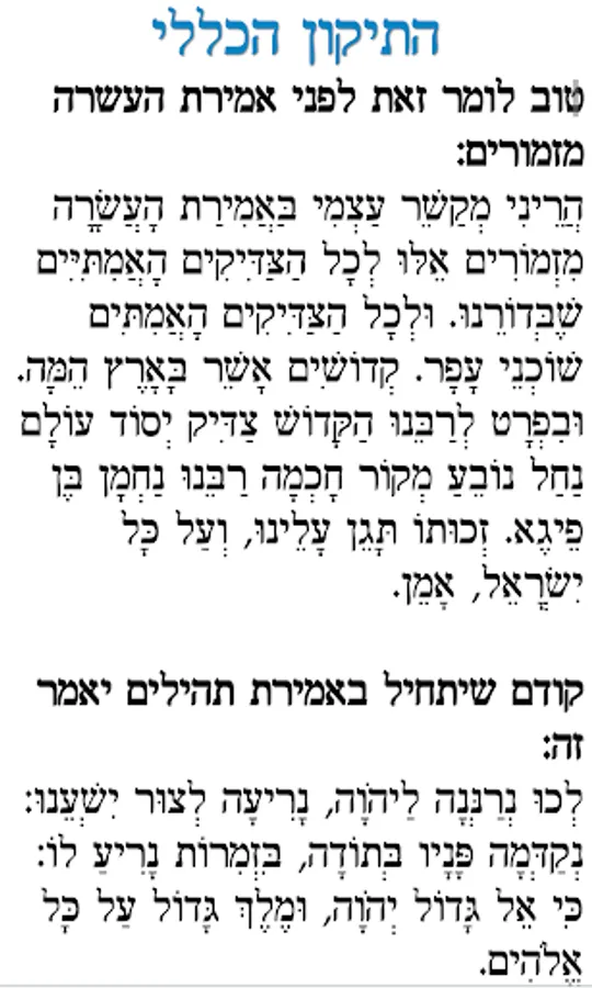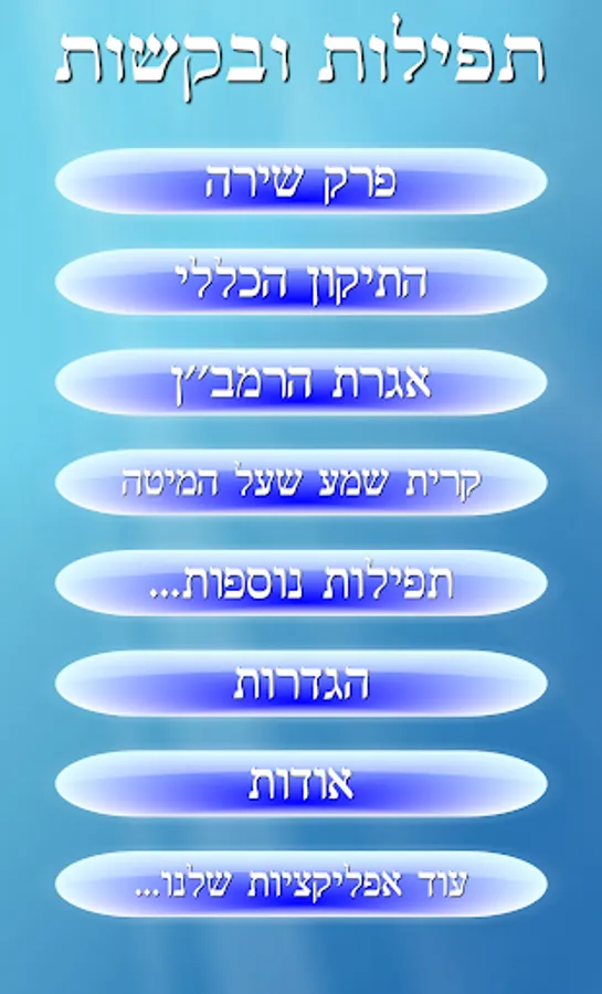 Prayers app you will find the prayer: Morning Blessings, Perek Shira, general correction, prayer at bedtime, every living soul, Letter of the Ramban, the Song of Songs, the incense, prayer Shelah, Hannah's prayer, prayer for Ishmael Priest, Rabbi Elimelech of prayer, a prayer of thanks, the order of challah, and more ...