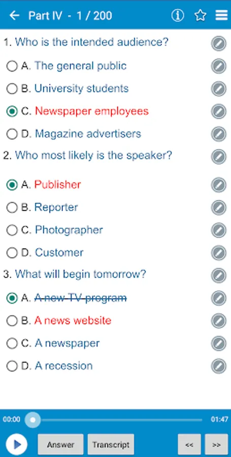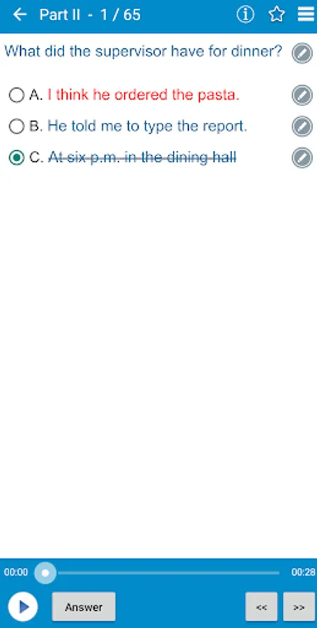 * Part 2 - Questions & Response: You will listen to a question then choose correct answer.