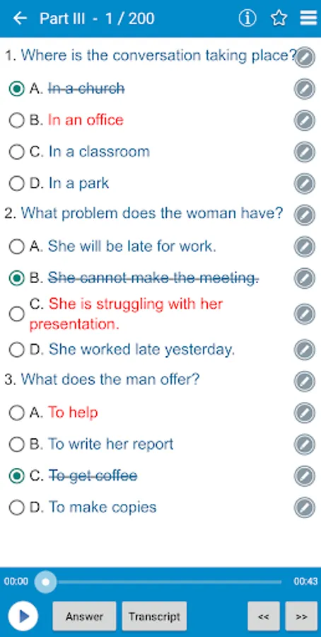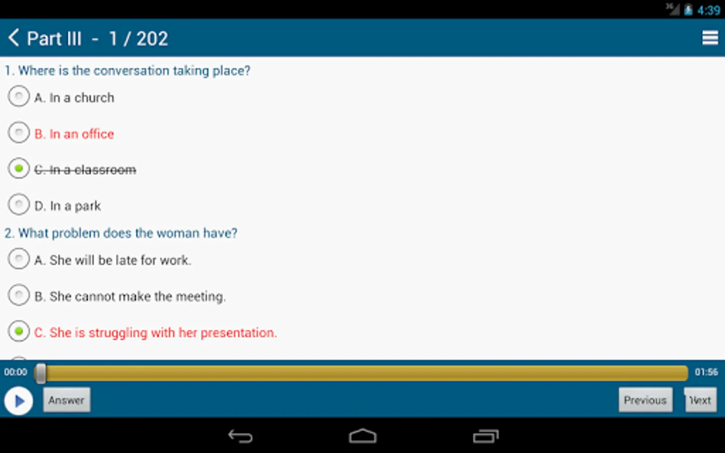 * Part 3 - Short Conversation: You will listen to a short conversation then choose correct answer.
