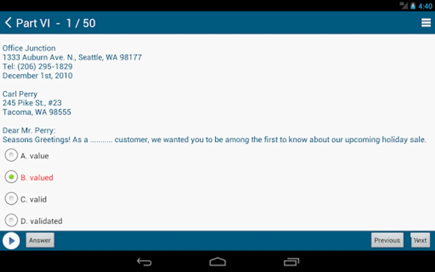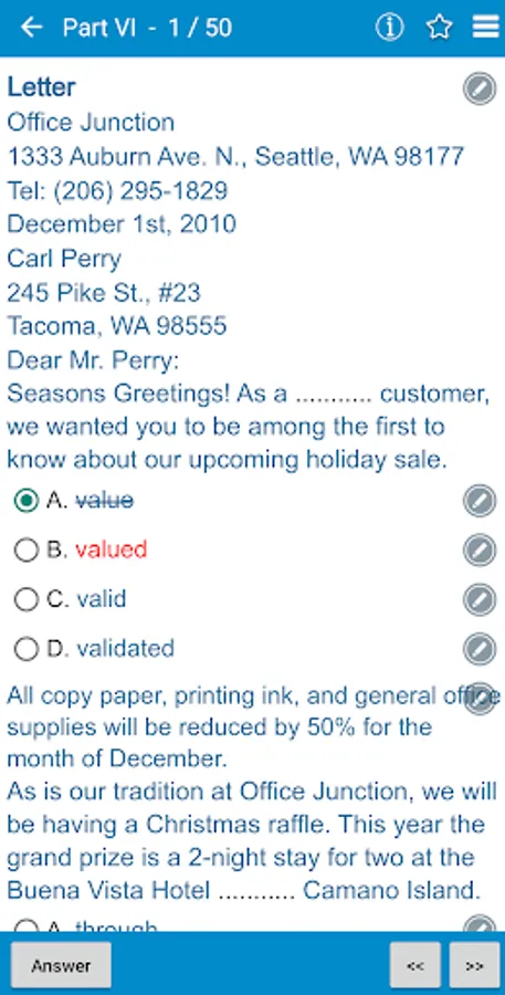 * Part 5 - Incomplete Sentences: Practice grammar and vocabulary.