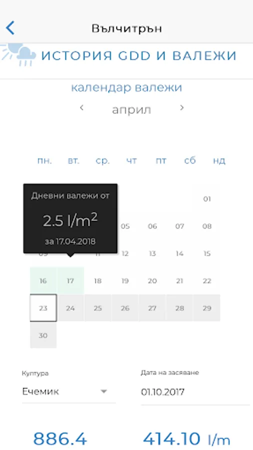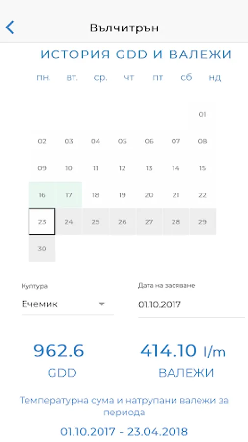 - GDD (accumulated temperature sum) depending on the crop sown and date of sowing.