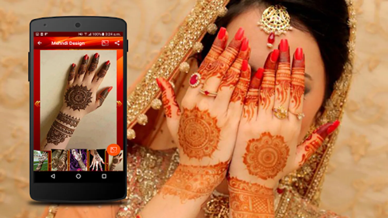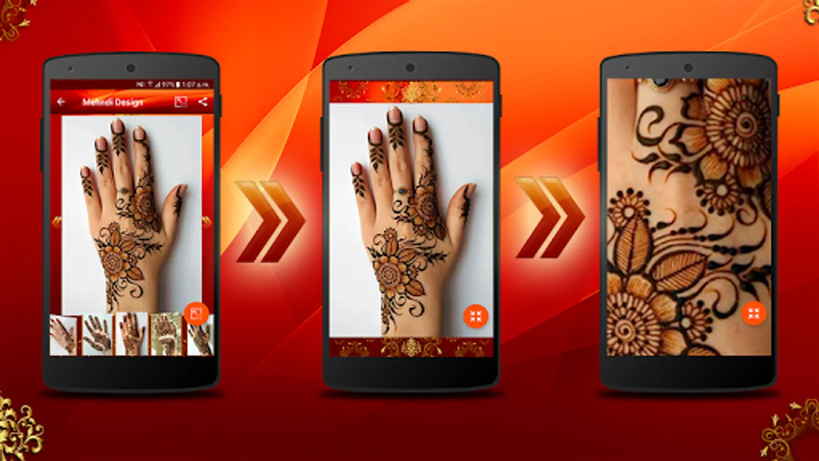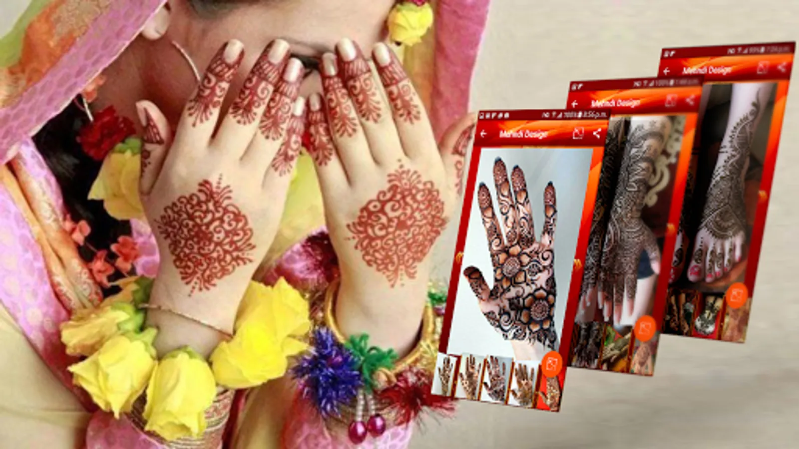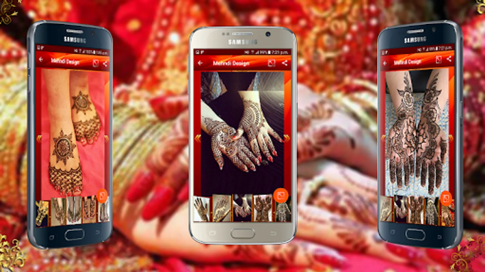 The application contains Mehndi tattoo, bridal, Eid, Karwachauth, Raksha Bandhan design, and Indian, Pakistani, Rajasthani, Arabic designs all are mixed in three categories.