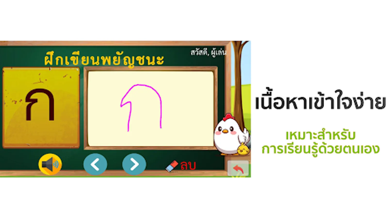 There are contents to learn basic Thai language skills such as reading aloud 44 Thai consonants, reading aloud vowels. Practice writing Thai consonants and practicing writing vowels, with 12 topics: images and sounds of consonants, images and sounds of vowels in Thai, practice of drawing consonants, 3 groups of letters, real diphthongs and false diphthongs, tonal inflection. , spelling of reduced and transformed vowels, distributing spelling of straight and non-standard spellings, leading letters, words with orthography, words with r, and words with rue