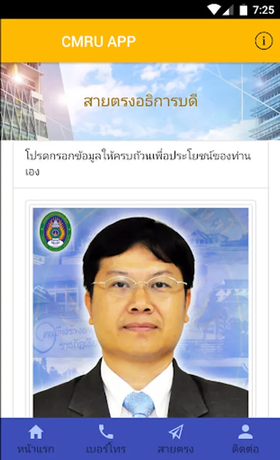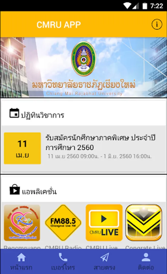 The system incorporates a calendar system that gives students an academic track academic work quickly as well as the link to the Application Portal. Application functionality. There is news for those who use the app to track length news happening in Chiang Mai Rajabhat University. A search for the telephone number within this forum convenient, users can dial the telephone number to call the application in the menu at all. User applications can also be sent directly to the President, through the direct line to the President as well.
