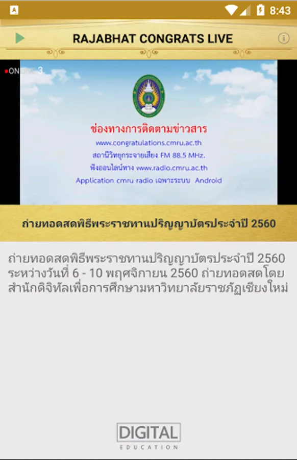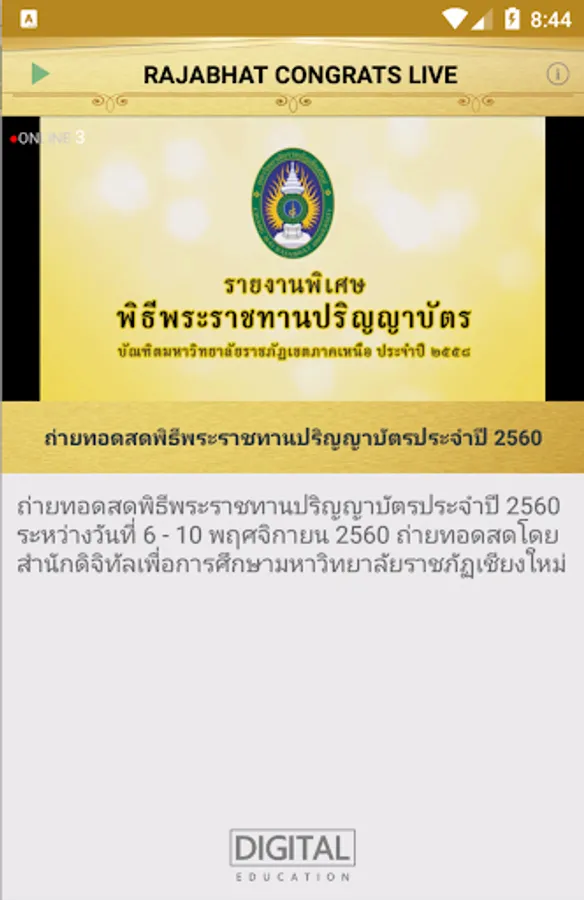Applications Applications Rajabhat Congrats Live app is an application developed by digital agency for education. Mai Rajabhat University With the aim of expanding the opportunity for published video and live graduation ceremony for graduates of the University of North 8th and events. The graduation ceremony will take place during work. To parents, faculty, staff and those interested in watching the event graduation ceremony without the restrictions of time and place.
